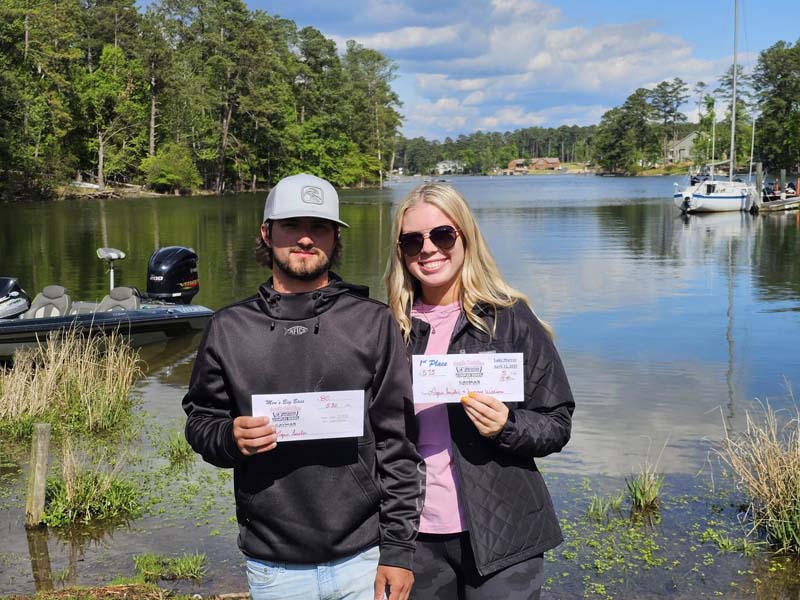 Logan Geisler and Summer Williams took the win with five bass for a total weight of 18.25 pounds, earning first place prize money of $575 and 197 points. Logan and Summer targeted bass feeding on the herring spawn. By 9 AM, they had 16 pounds on topwater lures. After hitting a couple more places, they caught their kicker bass weighing 5.19 pounds to give them their winning weight as well as Men’s Big Bass.