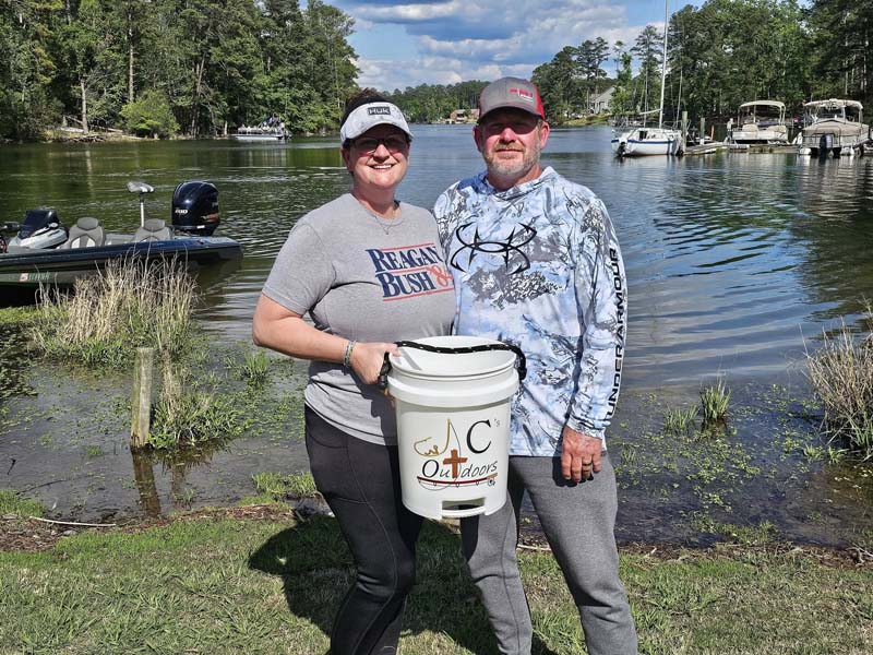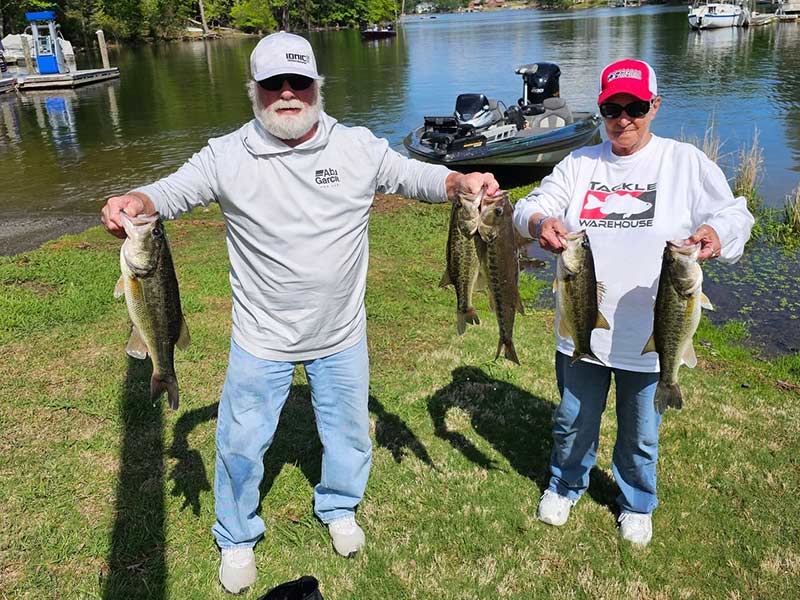 Fourth place went to John and Donna Branstetter with five bass weighing 15.31 pounds. The Branstetters won $125 in prize money and 194 points. John and Donna were on a herring bite pattern. They did not feel that the bedding bass would place due to the pressure put on the lake with recent championships. John caught a huge 12.78-pound bass in practice locking them into three points and two small rock piles. On tournament day, the winds had moved the herring off point, but the fish they caught came off of rocks around the points using Berkley Dredger 10.5 HD Blueback Herring and Owner Shakey Ultrahead 3/16 oz with Zoom Speed Worms.