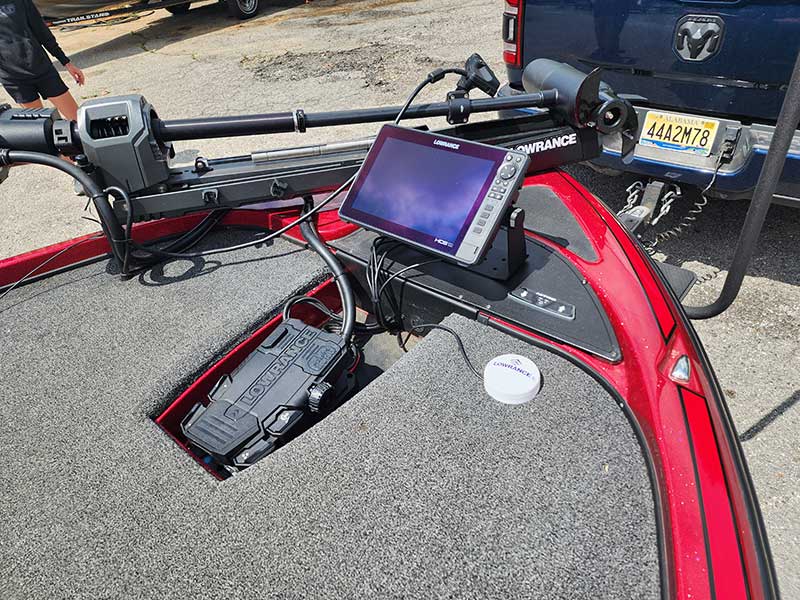 Console Lowrance HDS LIVE 16 flush-mounted fishfinder w/HD transducer, Active Target, and 3 in 1 Transducer, (Also on trolling motor).