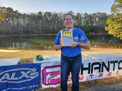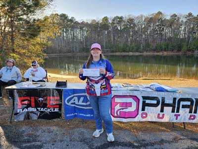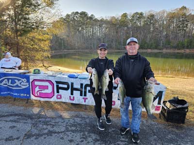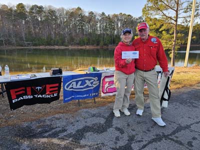 The team of Tom and Missy Bancroft ended up with a third-place finish, weighing in a 10.23-pound sack for 190 points and $125 in cash. Their bag was anchored with Missy’s 3.38-pound bass taking Ladies Big Bass and earning her $60. The Bancrofts started fishing the back of a creek to catch the majority of their weight on wacky worms and shaky heads. They finished in timber to cull up using same style baits. All bass were caught using ALX spinning rods and Lew’s reels.