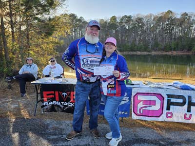 Ben and Ashley topped the leaderboard with a total weight of 13.90-pounds. Their bag was anchored by Ben’s 6.08-pound bass taking Men’s Big Bass of the tournament. First place earned the Suttons $475 in cash and 192 points to add to their lead in the National Standings. Ben also earned $55 for Men’s Big Bass.