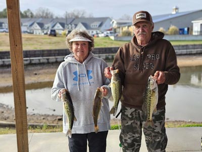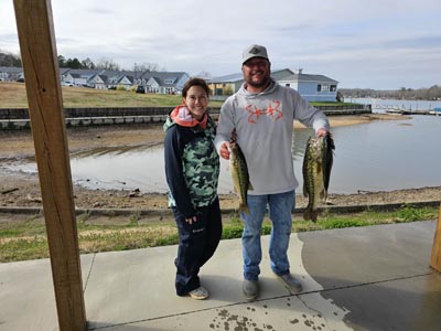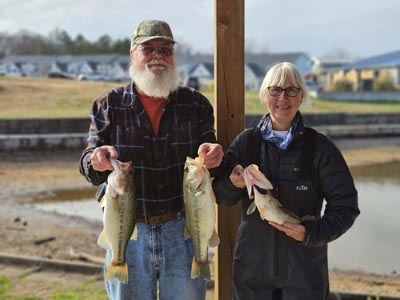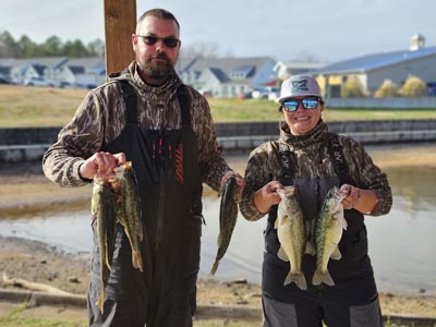 Tom and Missy Bancroft secured third place with 12.64 pounds, featuring Tom’s Big Bass weighing in at 4.15 pounds. Earning 198 points and $235. During practice they located 67-degree water up the Reedy River producing nice fish on spinner baits and traps in the flat. With the drop in temperature due to overnight rain, the bite slowed down. They changed to shakey heads rigged with scuppernong green worms and caught all of their fish off dock posts in less than 2-foot depth.